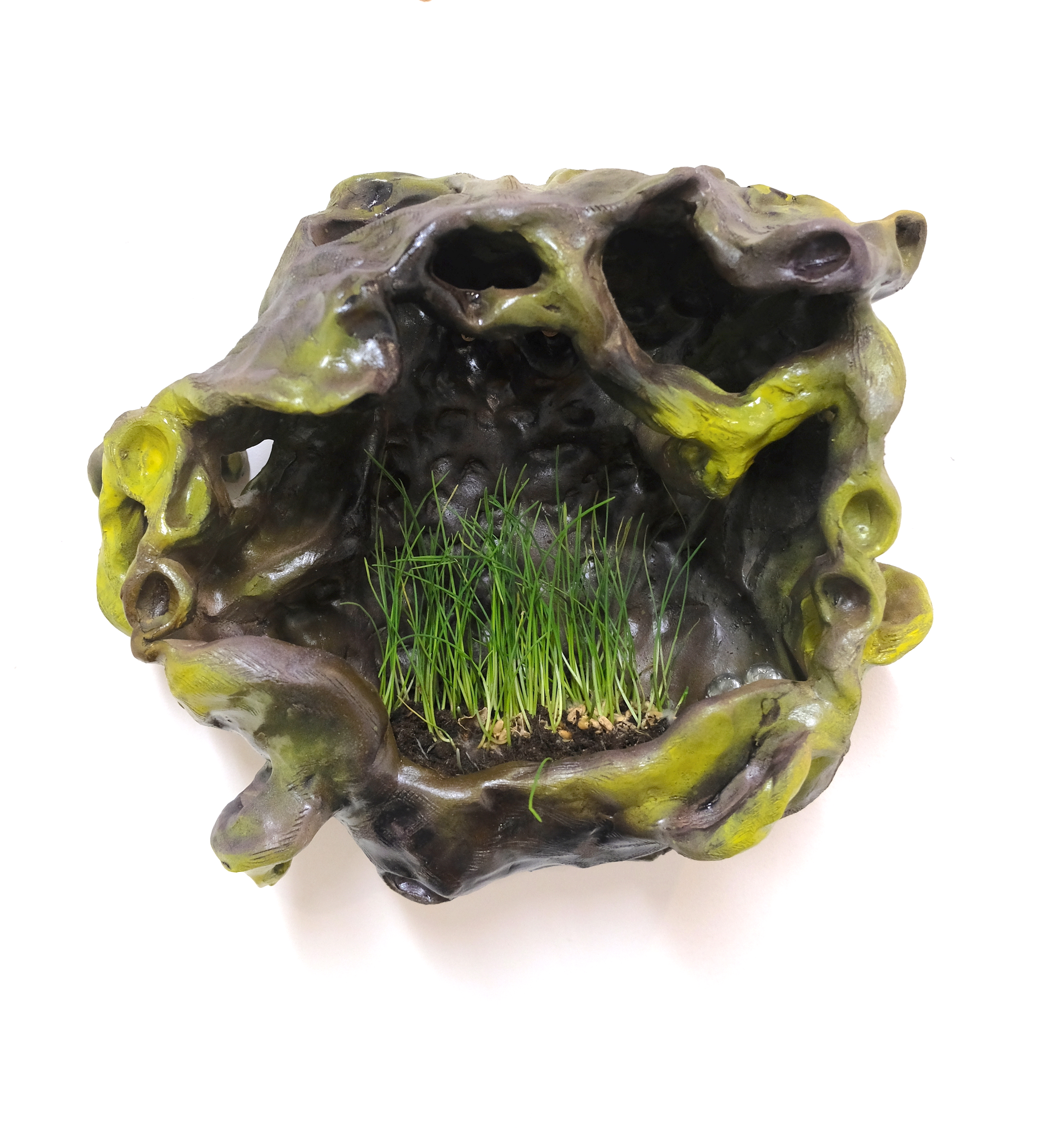 Unfired earthenware clay, spray paint, Wheatgrass, soil, Pewter